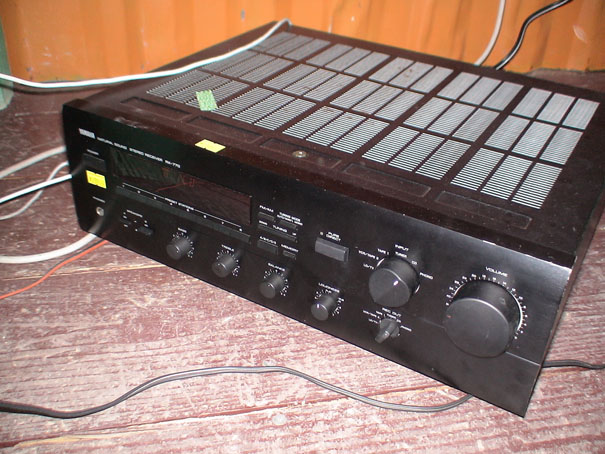 作業中に音が欲しくなってきたので、近所のリサイクルショップ「なんでも屋」で中古アンプを15,000円で購入。